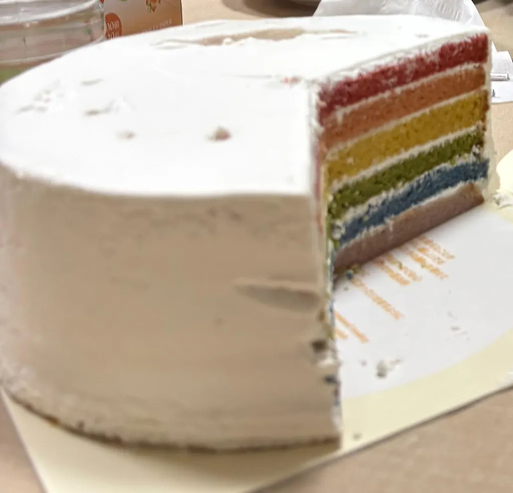 開発には合計で約一年間の試行錯誤を要しましたが、化学着色料を使わずに鮮やかなレインボーカラーを実現する方法をついに見つけました。そして、より多くの人々に楽しんでいただけるように、さらにもう一年をかけて小麦を使わないケーキのレシピを開発し、ついに二年の歳月を経て、最終的なレインボーケーキの基盤を確立しました。